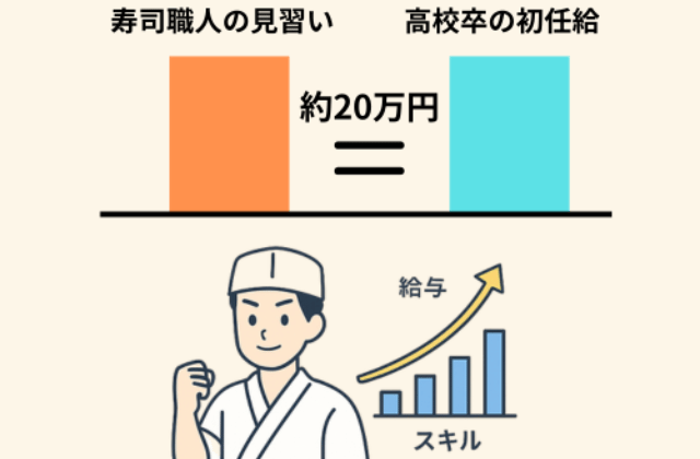 同じ調査では、新規学卒者の初任給は高校卒で約19.8万円でした。つまり、寿司職人の見習いの給与は高卒初任給とほぼ同じ水準であり、一般的な初任給と大きな差はありません。