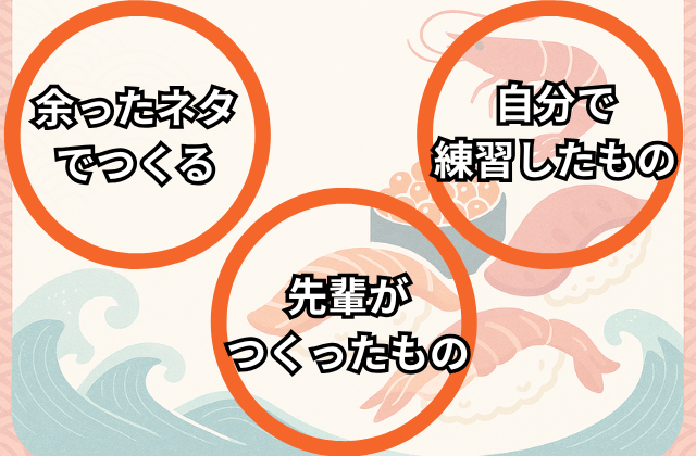 営業終了後などに残ったシャリやネタを使い、自分で寿司を握る練習を兼ねてまかないを作らせてもらえるケースもあります。