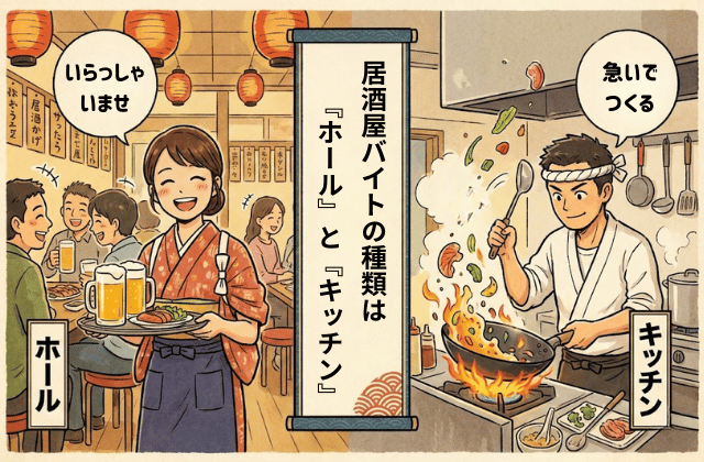 居酒屋バイトの業務は大きく「ホール」と「キッチン」に分かれており、それぞれの役割を理解しておくことが重要です。