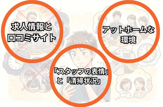 スタッフ同士が笑顔で声を掛け合って連携が取れているか、店長がアルバイトを怒鳴り散らしていないかなど、現場の空気感を肌で感じましょう。