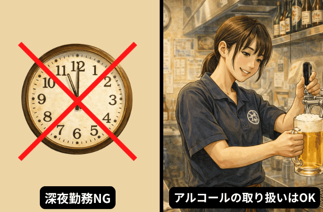 年齢によって、働ける時間帯やお酒の扱いに関するルールが変わります。