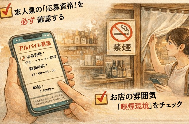 「屋内原則禁煙」「喫煙ブースあり(業務立ち入りなし)」などの記載があるか、お店のホームページや求人情報で確認しましょう。
