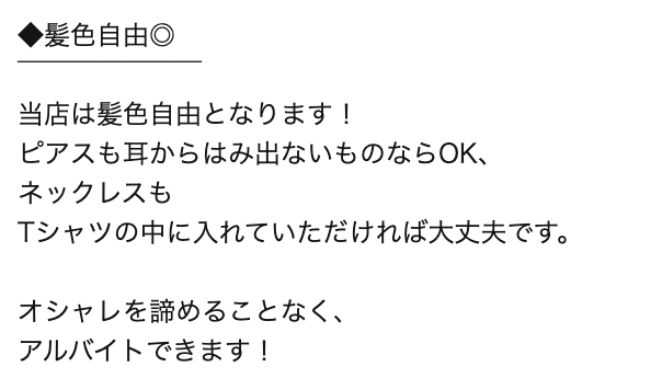 バイトのために黒染めをする必要がなく、大学生活のファッションを我慢せずに働ける環境が整っています。