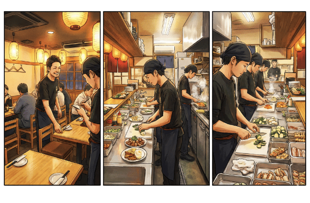居酒屋バイトの業務は、主にお客様と接する「ホール」、料理を作る「キッチン」、そして開店前の準備を行う「仕込み」の3つに大きく分類されます。