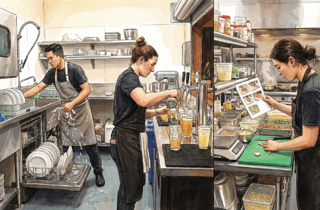 キッチンスタッフの主な業務は、調理補助、料理の盛り付け、使用済みの食器を洗う洗い場、そしてドリンクを作るドリンカーなど多岐にわたります。