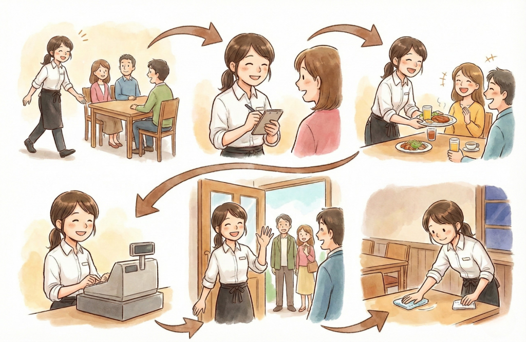 お店の「顔」であり、明るい挨拶や細やかな気配りが求められますが、特別なスキルが最初から必要なわけではありません。