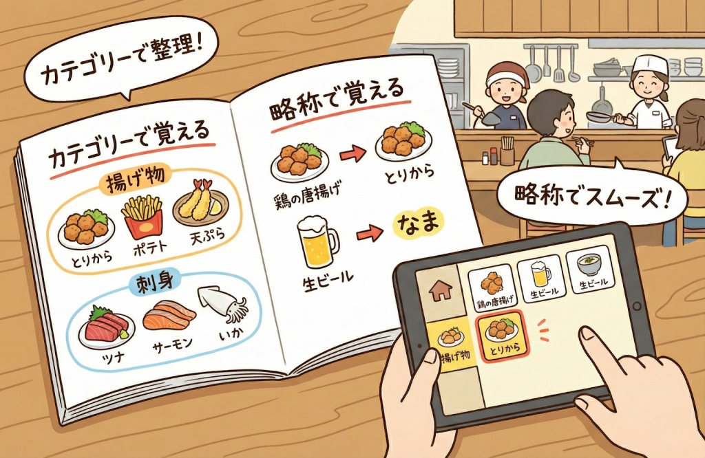 たとえば、「揚げ物」「刺身」といったジャンルで分けたり、先輩が使う略称(「とりから」など)とセットで覚えたりすると、ハンディの入力画面も探しやすいです。