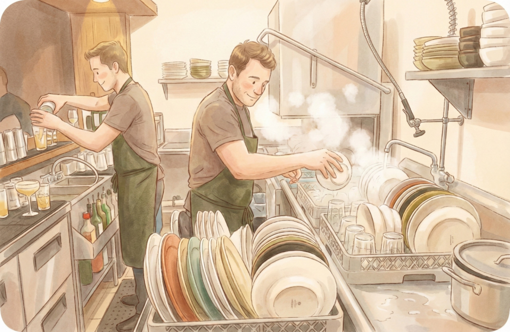 洗い場(ウォッシャー)の仕事は、単に食器を洗うだけでなく、皿の種類やサイズごとに仕分け、洗浄機へ効率よくセットするパズルゲームのような面白さがあります。