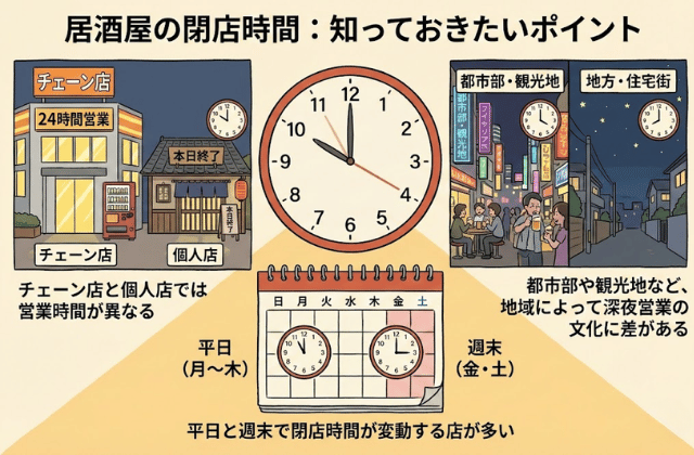居酒屋の閉店時間は、店舗の規模や立地によって異なります。