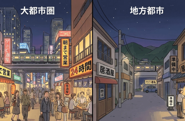対して、地方都市では終電や代行運転の終了に合わせて閉店する店が多く、深夜営業店は限られるでしょう。