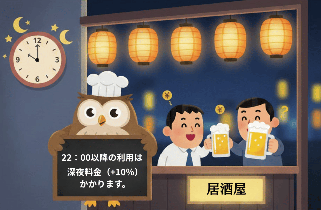 深夜帯(一般的に22時以降)の利用には、通常料金に加えて「深夜料金(10%程度)」や「サービス料」が加算される場合があります。