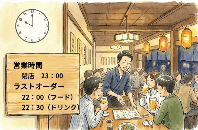 居酒屋のラストオーダーは、フードが閉店の1時間〜45分前、ドリンクが閉店の30分前に設定されるのが一般的です。