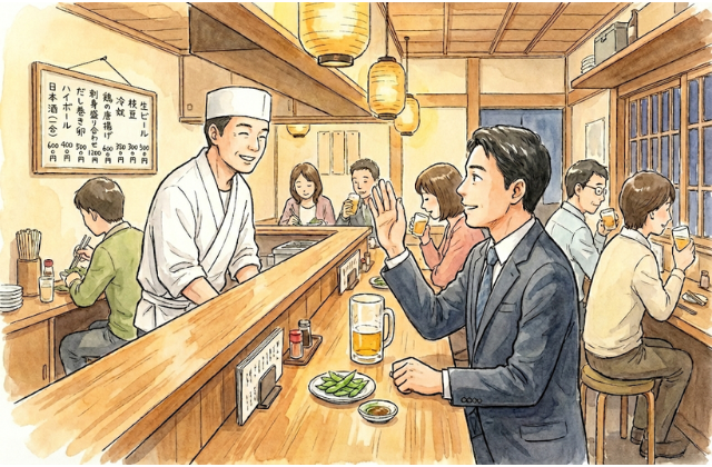 まずは、すぐ出るもの(枝豆、漬物、サラダ)を頼んで場をつなぎ、食事をしている間に「時間がかかる焼き物・揚げ物・煮込み」を注文、最後に「締め」へと移行するのが理想的な流れです。