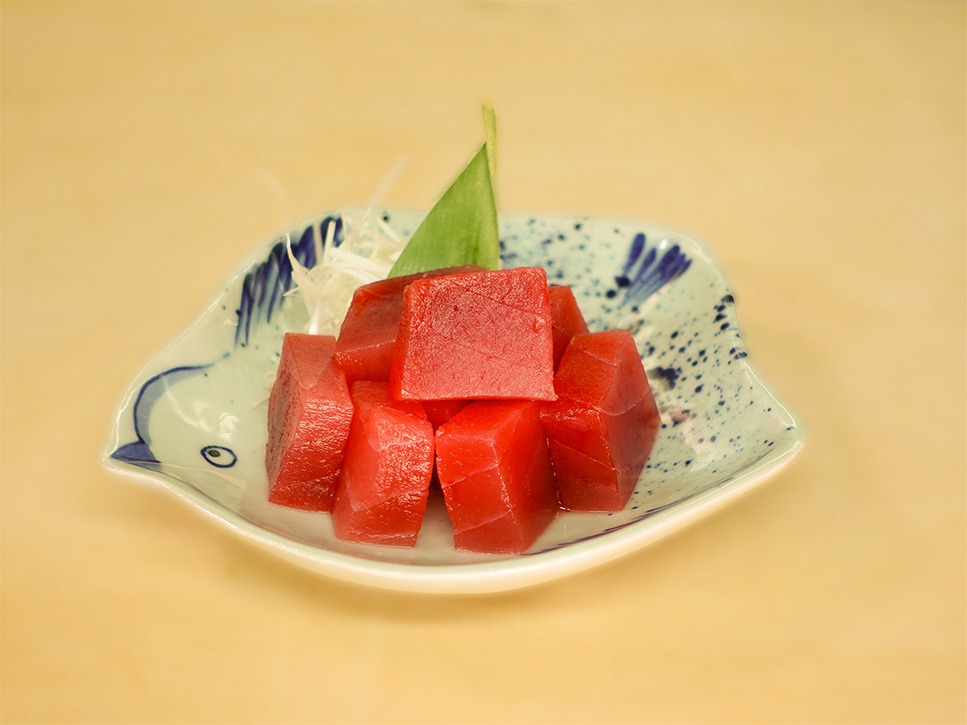 お通しとして提供するのは、新鮮で厚みのある「まぐろのブツ」。