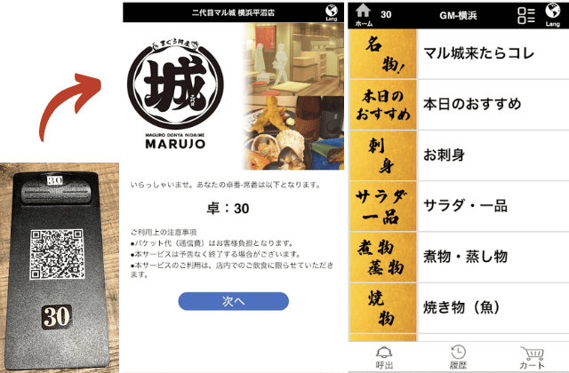 『まぐろ問屋 二代目マル城』ではモバイルオーダーを導入しており、会話を中断して店員を呼ぶ必要がなく、自分の好きなタイミングでスマホから簡単に追加注文が可能です。