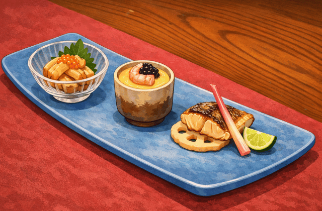居酒屋のつきだしが「とりあえずの一品」として即座に出されるのに対し、先付けはあらかじめ構成された献立の一部として組み込まれているのが特徴です。