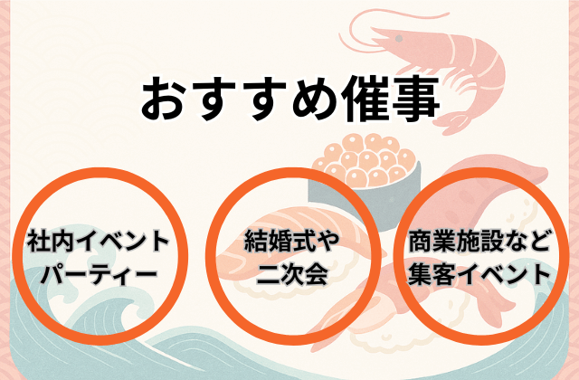 刺身や寿司など提供形態はオプションによって異なるため、イベントの趣旨にあったプランを選びましょう。