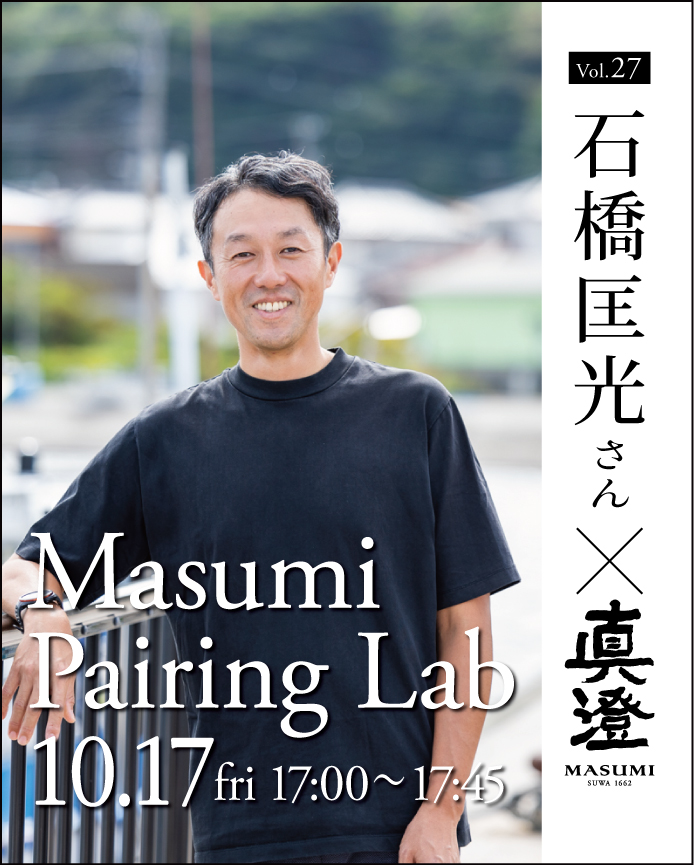 酒と料理の相性を知り抜いたペアリングのプロフェッショナル、食材の生産者、料理人なのにご登場いただき、真澄商品の楽しみ方をクロストーク形式で模索する「Masumi Pairing Lab」。今回は、ネオ・エモーション代表「石橋 匡光」がゲストとして登場します。真澄さんの手掛ける日本酒と合わせたスペシャル料理をペアリング形式でご紹介いたします。