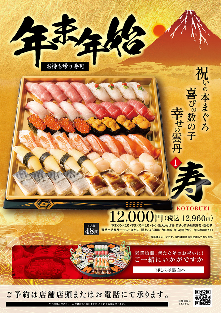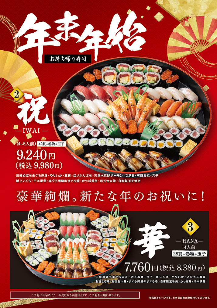 日頃より、ご利用誠にありがとうございます。本年も残りわずかとなりました。「一年の締めくくりに」、「新年の幕開けに」食卓を彩る華やかなテイクアウト寿司盛り合わせの予約がスタートいたしました。今年は様々なシーンでご利用いただけるよう、3種の盛り合わせを用意。