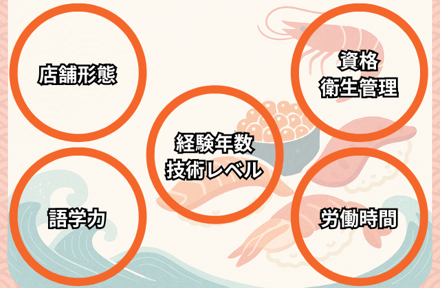 寿司職人の年収は、個人のスキルや働く環境によって大きく変わります。年収アップを目指すうえで、重要となる5つの要素は以下のとおりです。