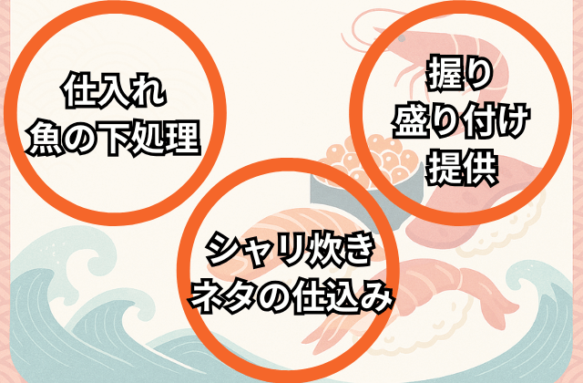 寿司職人の仕事は、カウンターで寿司を握るだけではありません。お客さまに最高の状態で寿司を提供するため、多岐にわたる業務を日々こなしています。