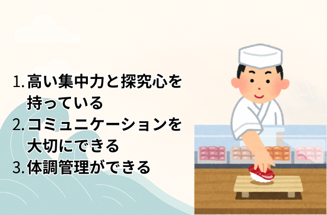 重い米袋を運んだり冷水で魚を扱ったりと、体力が求められる場面も多いです。最高のパフォーマンスを維持するためには、常に万全のコンディションを保つ自己管理能力が必須です。