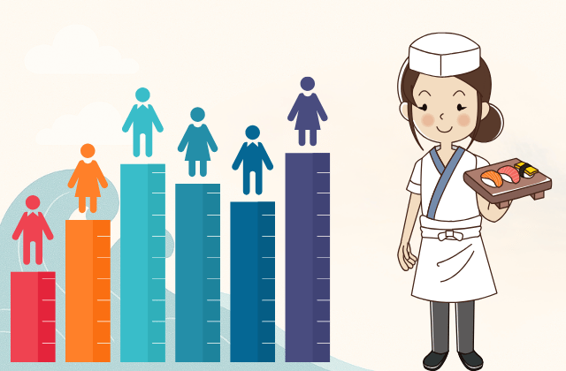 多くの企業では、魚を捌く・握る・シャリを炊くといった技術項目ごとに評価基準を設けており、その習熟度が上がることで昇給する仕組みです。