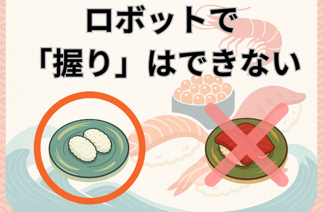 現在の寿司職人ロボットの技術は、シャリ玉を一定に成形するのは得意ですが、シャリとネタを一体化させる「握り」の工程は困難です。