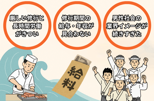 寿司職人が不足している背景には、寿司業界が長年抱えてきた以下3つの構造的な問題があります。