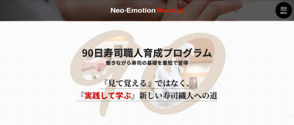 ネオ・エモーションでは、未経験からでもプロの寿司職人を目指せる独自の「90日寿司職人育成プログラム」を導入しています。