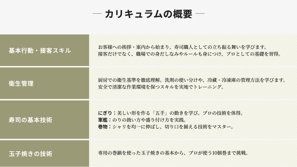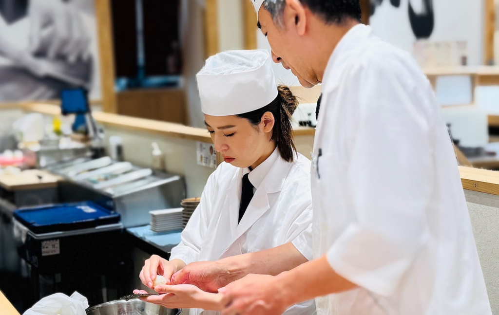 「90日寿司職人育成プログラム」では、OJTと座学を組み合わせ、現場での実践と知識の習得を両立できる環境を整えています。
