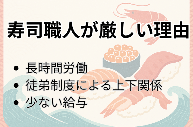 寿司職人の下積み期間は給与水準が低く設定されている場合があり、生活が安定しにくい点が修行を厳しく感じさせる理由の一つです。