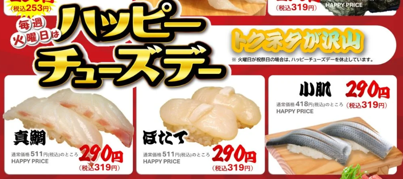毎週火曜日は「ハッピーチューズデー」と題したお得なサービスを行なっており、普段よりもリーズナブルに本格的なお寿司を味わえます。