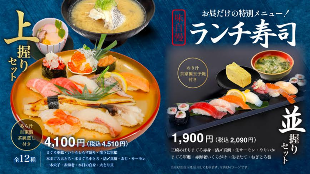 豪華12貫にあら汁・茶碗蒸し付きの「上握りセット」や、バランスよく定番ネタを楽しめる「並握りセット」は、ランチタイムを贅沢に彩ってくれます。