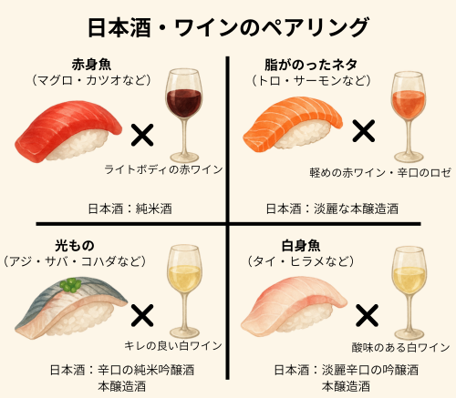 一般的には、赤身には軽めの赤ワインやコクのある純米酒、淡白な白身魚にはスッキリとした辛口の日本酒や白ワインがよく合います。