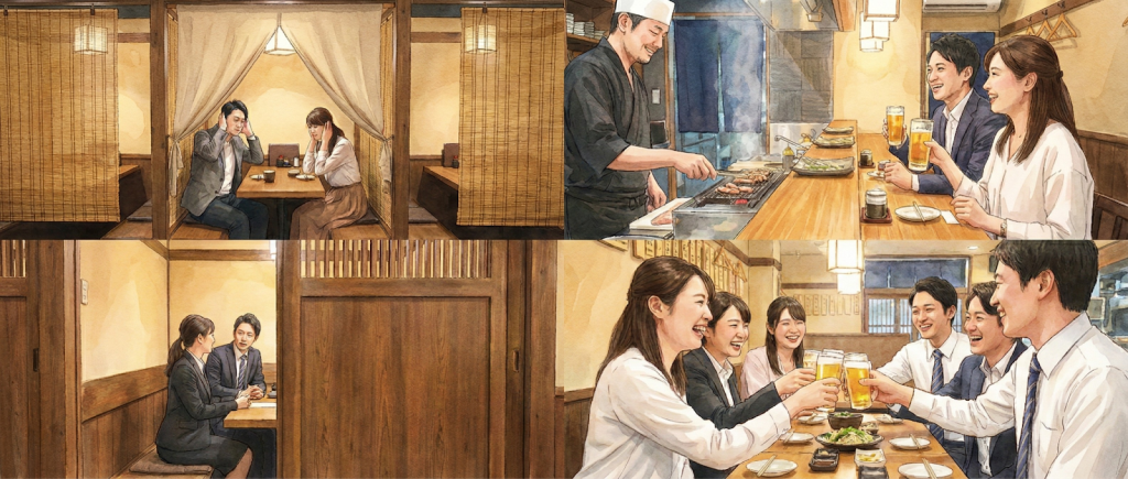 「個室あり」という情報だけで予約をしてしまうと、実際には薄いすだれで仕切られただけの半個室で、隣の席の声が丸聞こえだったという失敗談はよくあります。