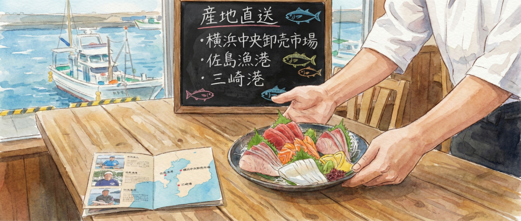 「横浜中央卸売市場」や「佐島漁港」「三崎港」など、具体的な地名や市場名が書かれている店は、鮮度への自信があるため信用できると言えます。
